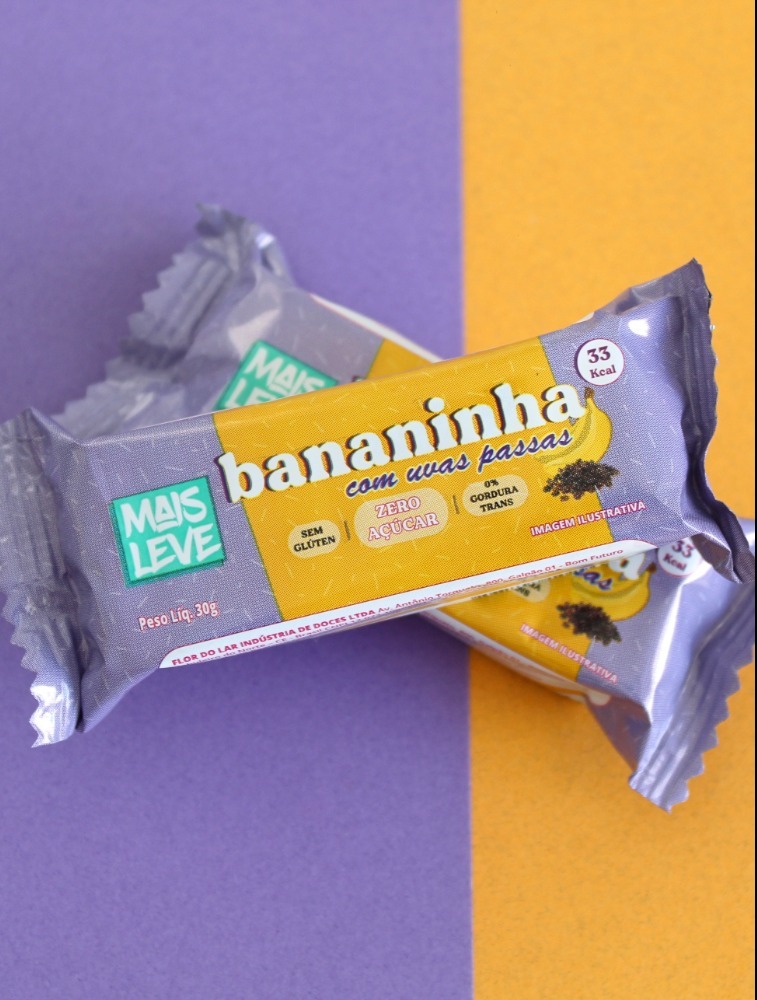 CARACTERÍSTICAS: 33 calorias a unidade, vegano, sem açúcar, sem glúten, sem corantes, sem lácteos, sem perigo de contaminação cruzada, zero gordura trans, feita diretamente da banana nanica e da uva passa, sem utilização de polpas, fonte de fibras e rico em potássio.