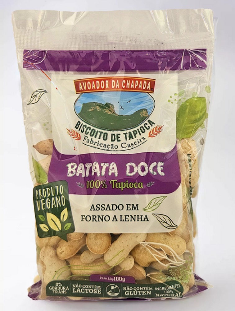 Tapioca (Polvilho de Mandioca), Água, Sal Marinho, Gordura Vegetal de Palma, Ovo Caipira, Açúcar Mascavo Orgânico, Batata Doce e Semente de Linhaça Dourada e Marrom.