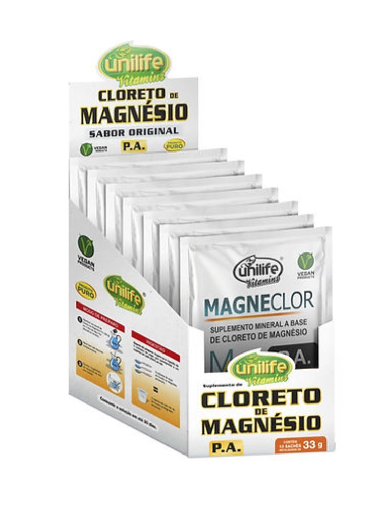 O Cloreto de Magnésio MagneClor P. A. Hexahidratado Unilife Vitamins é um suplemento alimentar VEGANO, desenvolvido com magnésio e o mineral cloro. Livre de glúten.