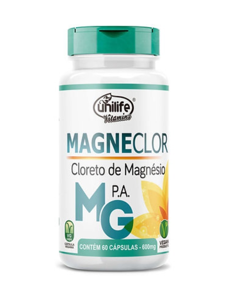 O Cloreto de Magnésio Magneclor Hexahidratado P.A. Unilife Vitamins é um suplemento VEGANO, desenvolvido a partir de magnésio hexahidratado. Livre de glúten. O magnésio auxilia na formação de ossos e dentes, no metabolismo energético, no metabolismo de proteínas, carboidratos e gorduras, no equilíbrio dos eletrólitos, no funcionamento muscular e neuromuscular e no processo de divisão celular.