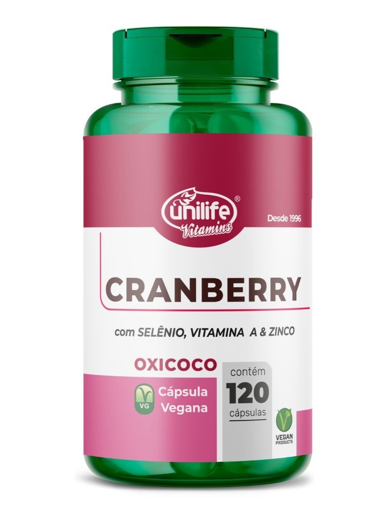 A Cranberry também conhecida como oxicoco, arando-vermelho, mirtilo-vermelho, airela é um fruto ácido que auxilia na boa saúde do sistema urinário. A cranberry é rica em Vitaminas A, C, ácido fólico, manganês e potássio.