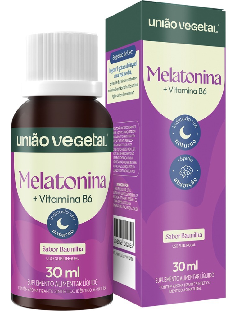 A fórmula da União Vegetal une melatonina e vitamina B6 em solução sublingual, com sabor baunilha e absorção rápida, ideal para a rotina noturna.