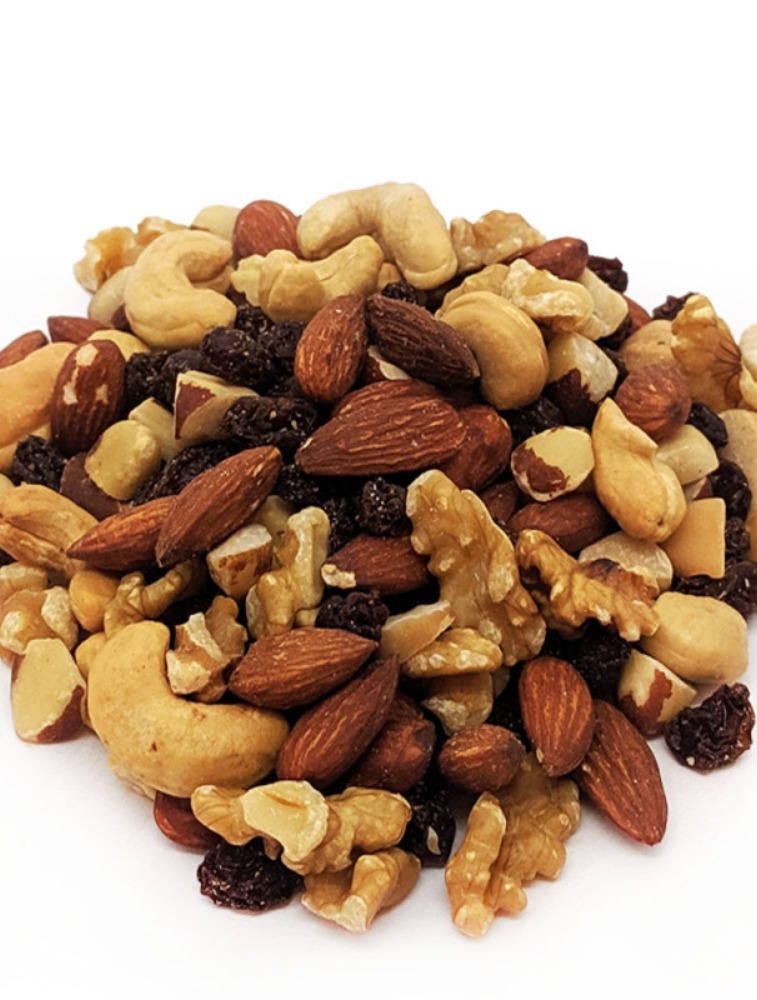 30% uva passa preta, 20% castanhas de caju W1 torrada sem sal, 20% amêndoas torradas sem sal, 20% castanha do pará em pedaços e 10% nozes quartilho extra light.