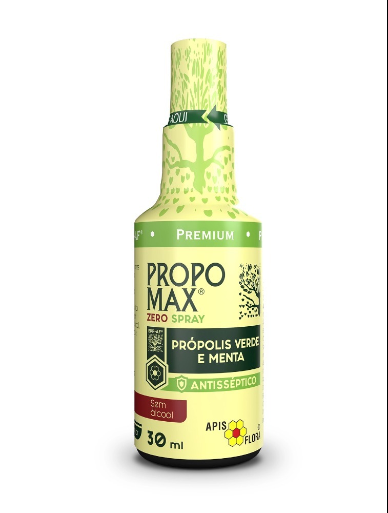O Propomax® Zero Spray possui em sua composição extrato de própolis e óleo essencial de menta (Mentha piperita). É um spray aromatizante bucal com ação antisséptica especialmente indicado para pessoas que não podem consumir álcool, além de ser um produto sem açúcar.
