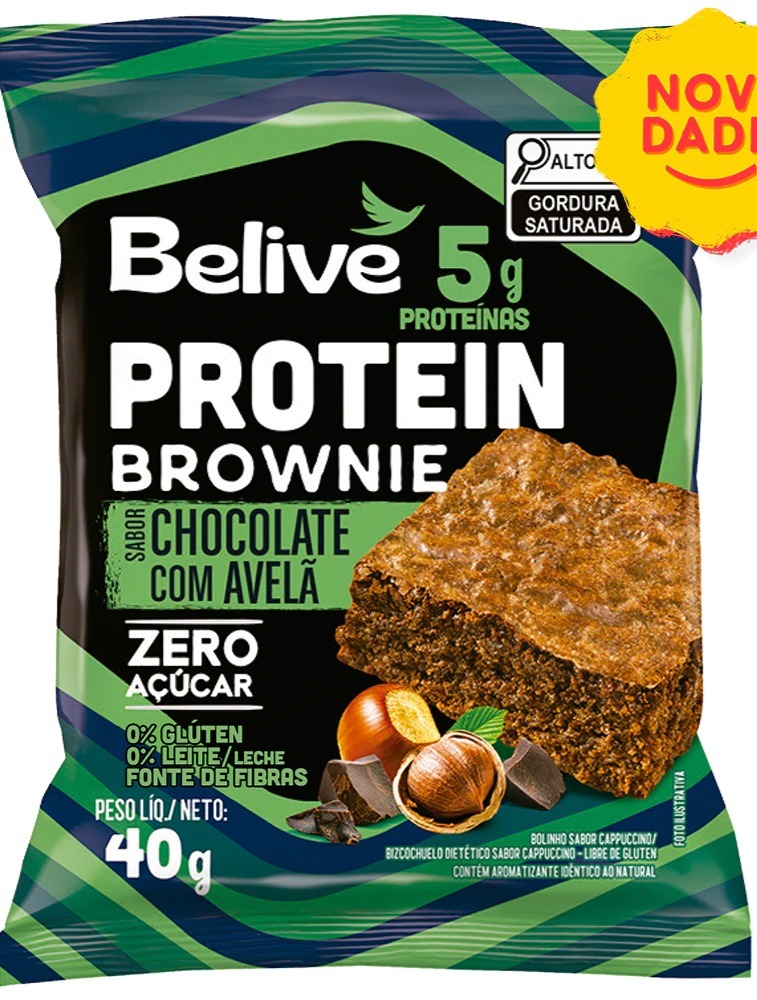 INGREDIENTES: Mix sem glúten (proteínas isoladas de soja e arroz; farinha integral de avelã, farinha integral de sorgo), óleo de soja, fibra solúvel polidextrose, ovo em pó, pasta integral de avelã, gotas sabor chocolate, cacau em pó, extrato de levedura, edulcorantes maltitol e glicosídeos de esteviol, umectantes sorbitol e glicerol, emulsificantes mono e diglicerídeos de ácidos graxos e goma xantana, aromatizantes, conservantes propionato de cálcio e sorbato de potássio, acidulante ácido cítrico e fermento químico bicarbonato de sódio. NÃO CONTÉM GLÚTEN. ALÉRGICOS: CONTÉM DERIVADOS DE SOJA, AVELÃ E OVO.