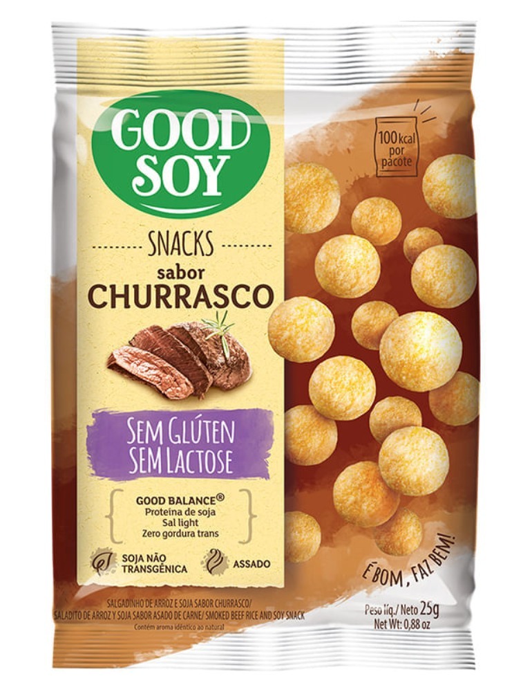 O Snack de Soja Churrasco Good Soy 25g é assado feito à base de farinha de arroz e de soja não transgênica, com sal light, zero gordura trans e sem aromas artificiais.