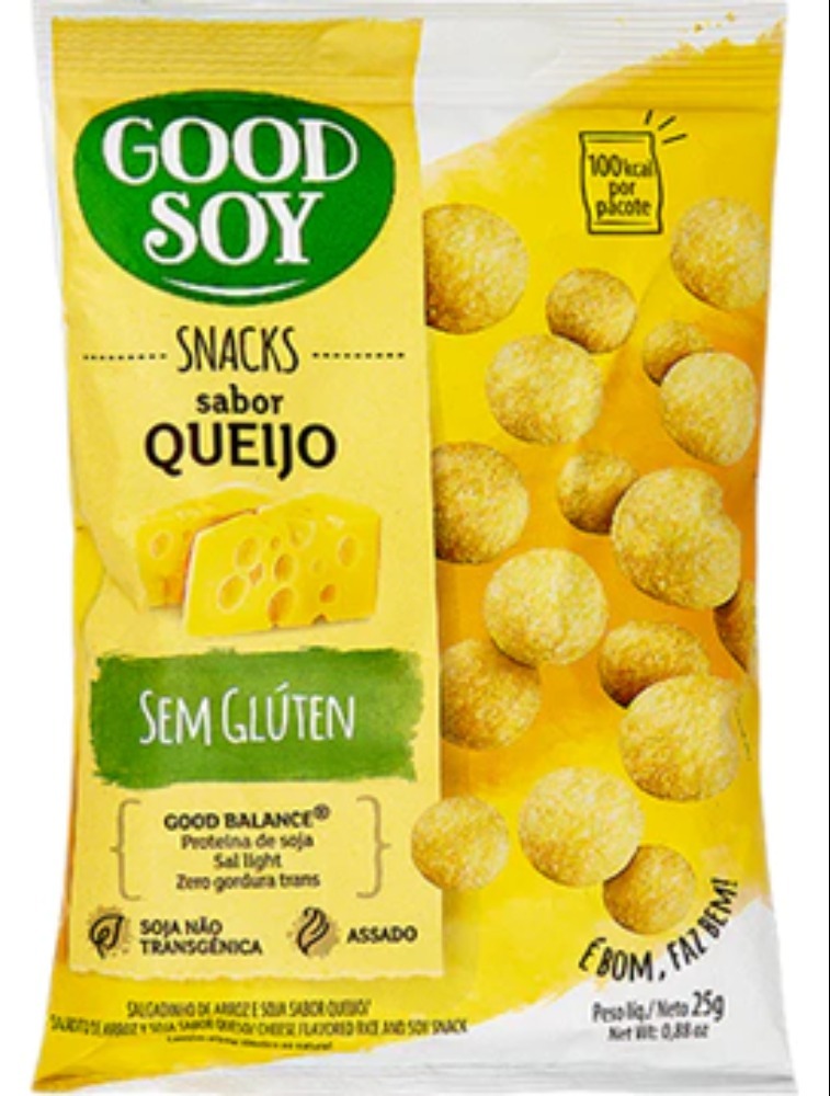 - Ingredientes: Farinha de arroz, farinha integral de soja não transgênica, óleo vegetal (palma, soja), condimento preparado sabor queijo, sal light, corante urucum. Não contém glúten.