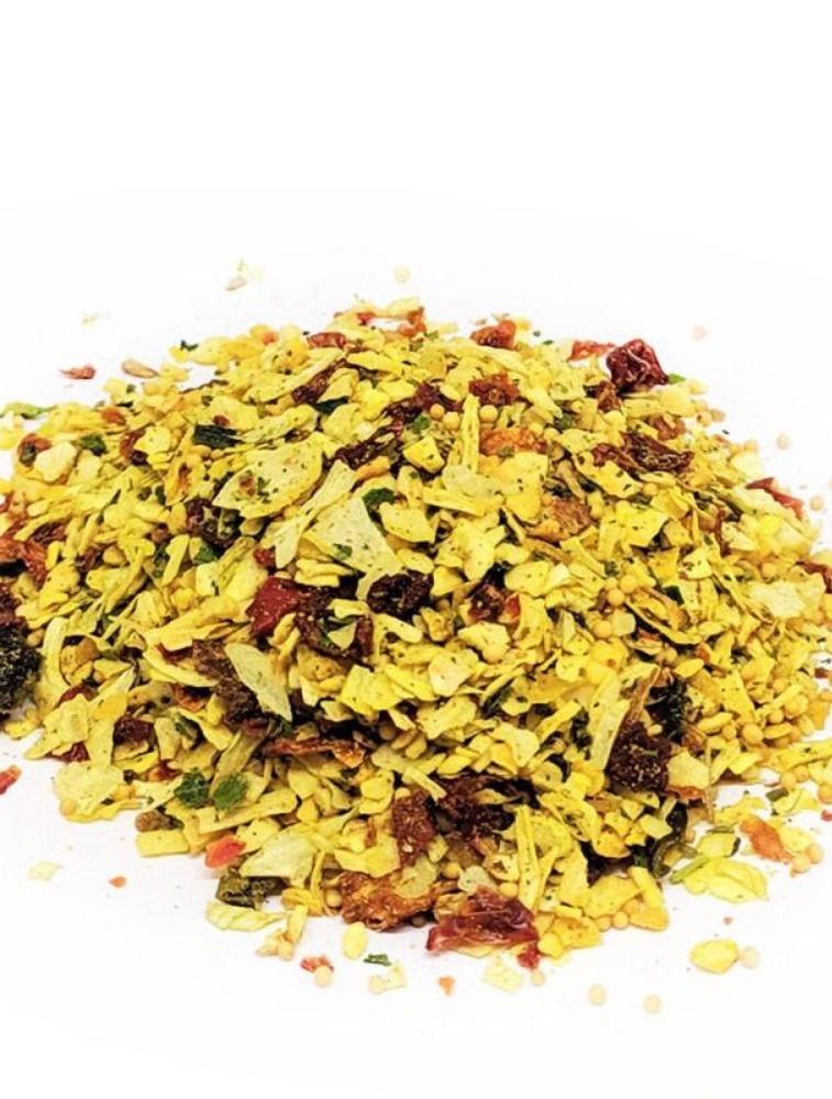 Ingrediente: Cebola desidratada; Açafrão; Ajinomoto; Mostarda em pó; Alecrim moído; Tomate desidratado; Pimentão verde desidratado; Salsa desidratada; Alho desidratado. Zero sódio. NÃO CONTÉM GLÚTEN.