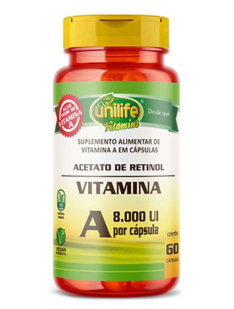 A Vitamina A Unilife Vitamins é um suplemento VEGANO, desenvolvido com a vitamina A (retinol) e excipientes. Livre de glúten. A vitamina A auxilia na visão, funcionamento do sistema imune, metabolismo do ferro, manutenção da pele e de mucosas e no processo de diferenciação celular.